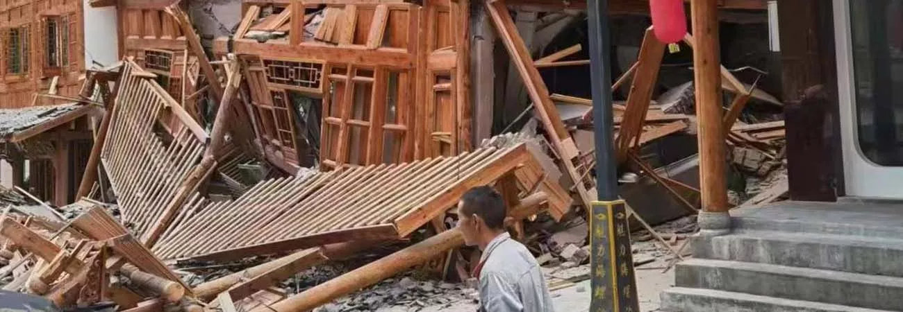 چین کے جنوب مغربی صوبے سیچھوآن کی کاؤنٹی لوڈنگ کے قصبے موشی میں زلزلے سے تباہ ہونیوالی عمارتوں کا ایک منظر۔(شِنہوا)