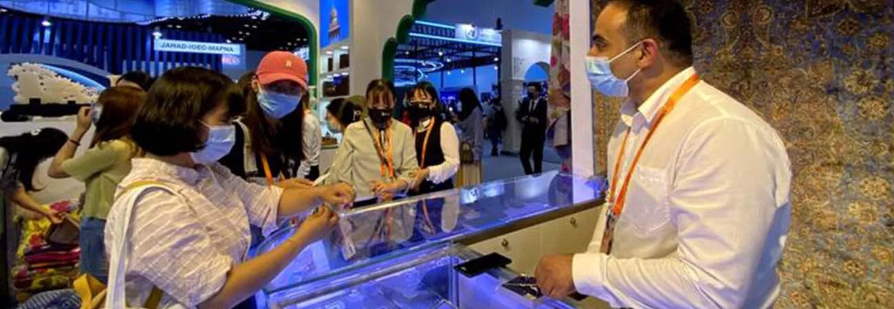 عقیل احمد چوہدری (دائیں ) چائنہ انٹرنیشنل فیئر فار ٹریڈ اِن سروسز 2022 کے دوران پاکستان پویلین میں صارفین کو زیورات دکھاتے ہوئے۔(شِنہوا)