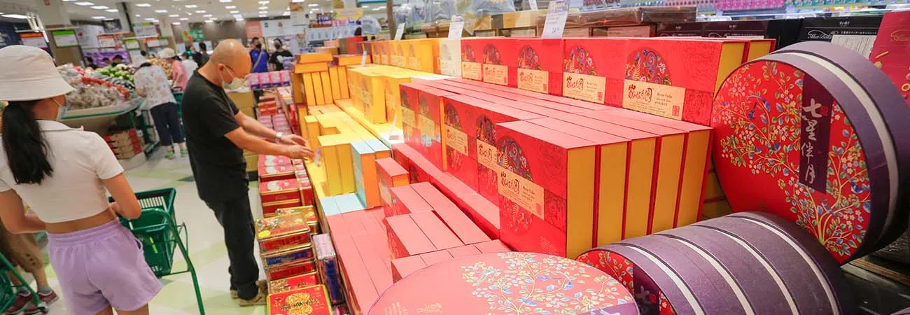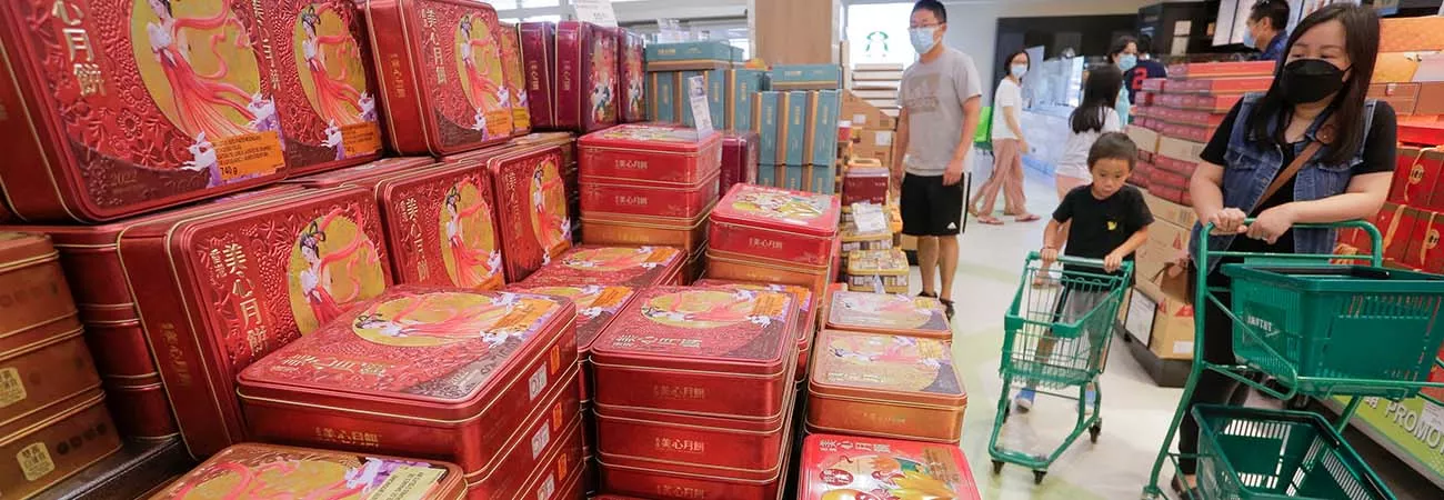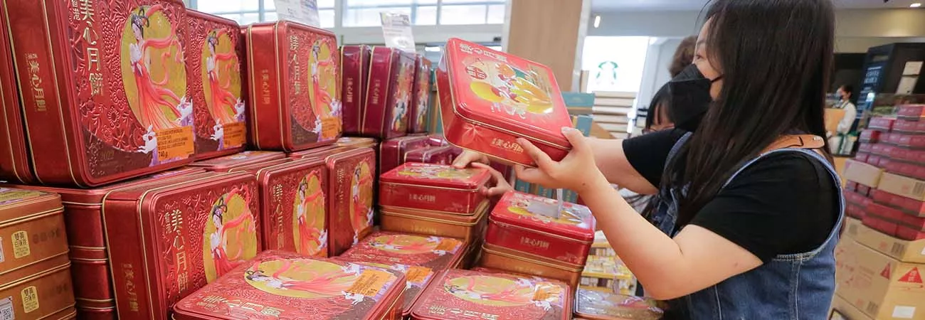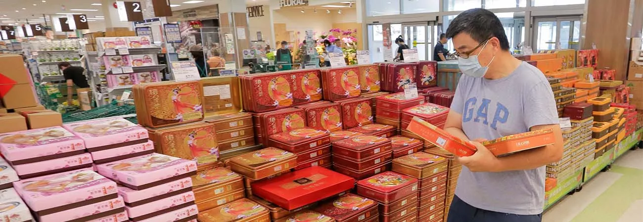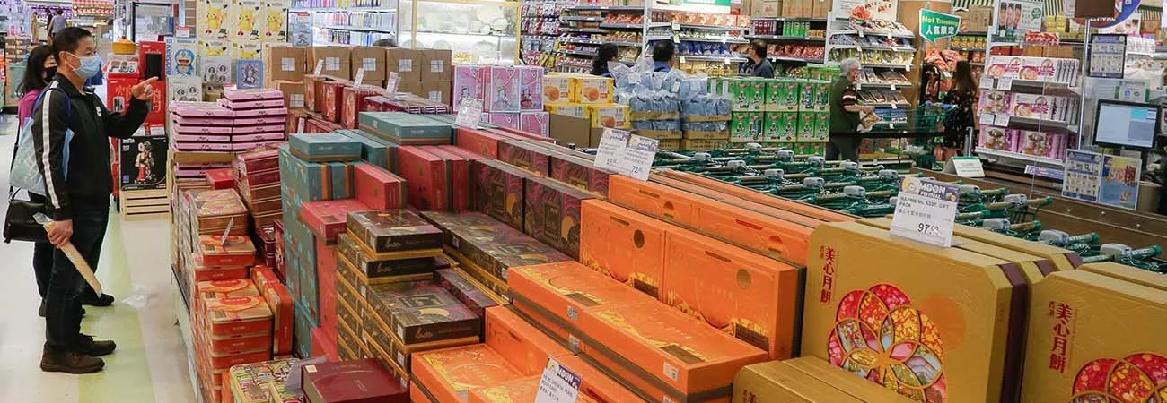 کینیڈا میں برٹش کولمبیا کے وینکوور میں وسط خزاں کے تہوار کے سلسلے میں ایک گاہک مون کیک فروخت کرنیوالی چینی سپرمارکیٹ میں خریداری کر رہا ہے۔(شِنہوا)
