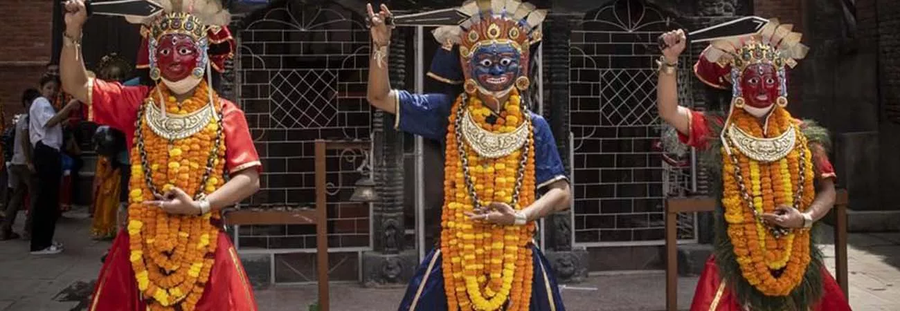 نیپال میں رقاصوں نے للت پور کی سڑک پر رنگ برنگ ملبوسات پہن کر تہوار کی خوشیاں منائیں اور فن کا مظاہرہ کیا۔