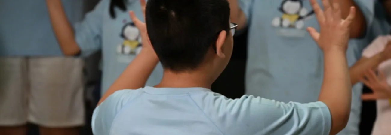 چین کے دارالحکومت بیجنگ میں سمرکیمپ کی ڈرامہ پرفارمنس کے دوران ایک 11 سالہ لڑکا بن بن (آگے) دوسرے بچوں کو اشاروں کی زبان سیکھارہا ہے۔ (شِںہوا)