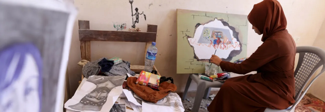 غزہ (شِنہوا) غزہ کی پٹی کے جنوبی شہر خان یونس میں کئی فلسطینی فنکار اپنے ساتھی فنکار دونیا الامور کے تباہ شدہ گھر یکجا ہوئے اور ان کی یاد میں پیٹنگ کی۔ 22 سالہ فنکار 5 اگست کو فلسطینی اسلامی جہاد (پی آئی جے) کے خلاف اسرائیلی طیاروں کے فضائی حملے میں جاں بحق ہوگئے تھے۔
