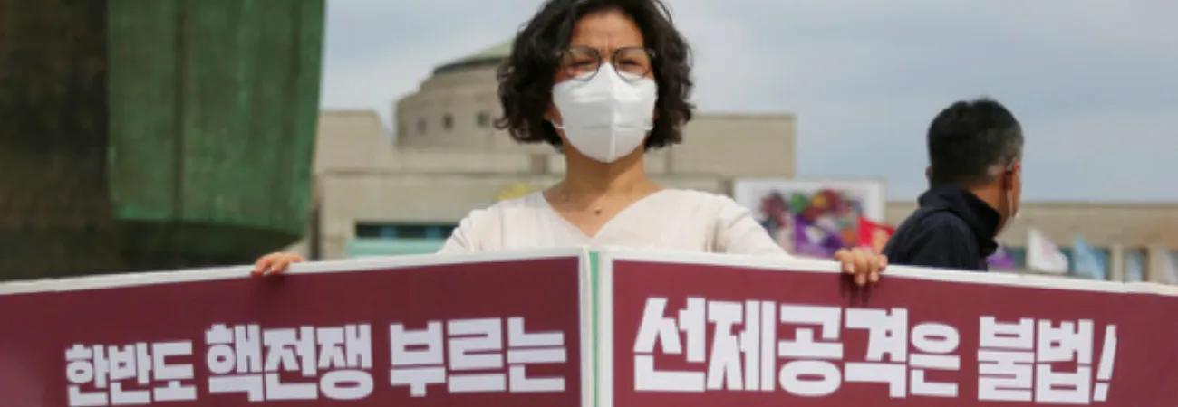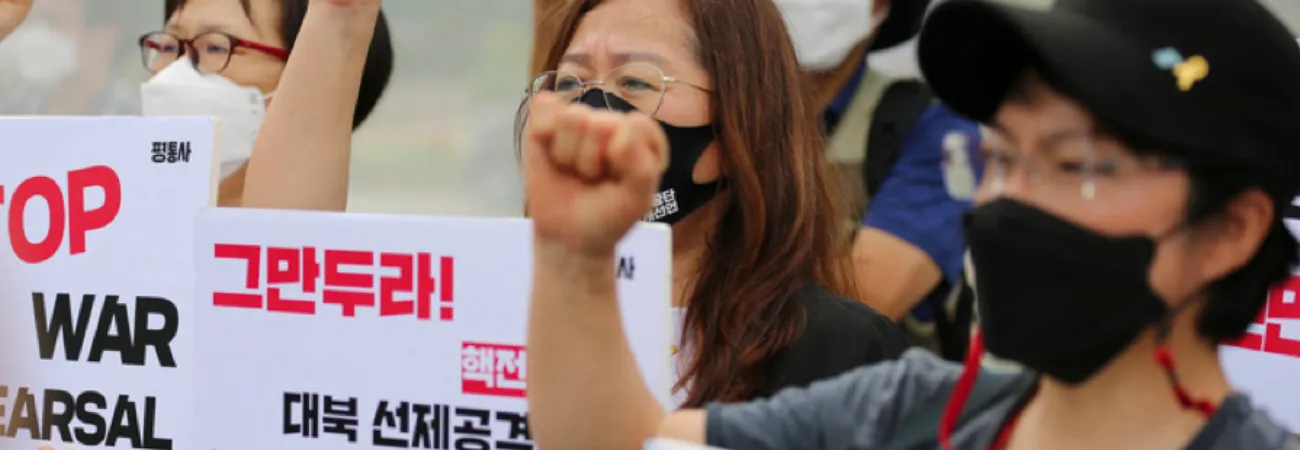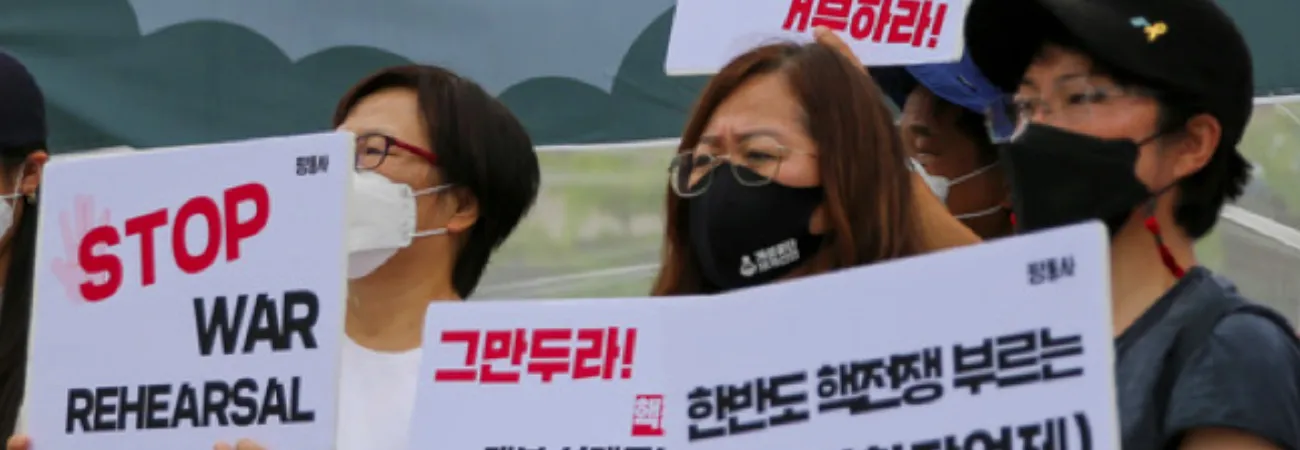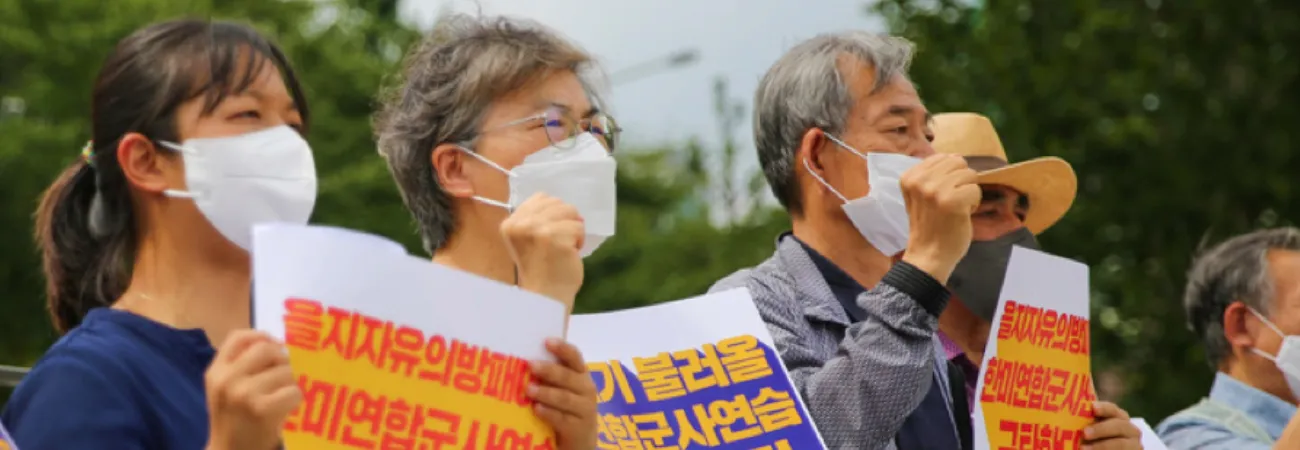 جنوبی کوریا کے سیئول میں احتجاجی مظاہرین جنوبی کوریا ۔ امریکہ فوجی مشقوں کیخلاف ریلی نکال رہے