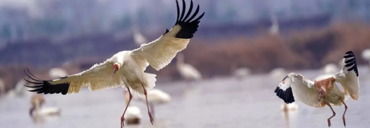 چین کے مشرقی صوبہ جیانگ شی کے نان چھانگ میں سفید کونج پویانگ جھیل کے کنارے سفید کونج کے تحفظ کے علاقے پر اُڑ رہے ہیں۔(شِنہوا)