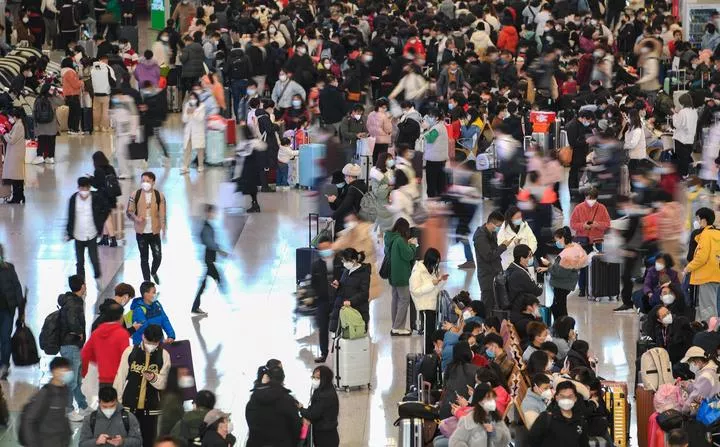 چین کے جنوبی صوبہ گوانگ ڈونگ میں شین ژین نارتھ ریلوے اسٹیشن میں مسافر ٹرینوں پر سوار ہونے کی تیاری کر رہے ہیں۔(شِنہوا)