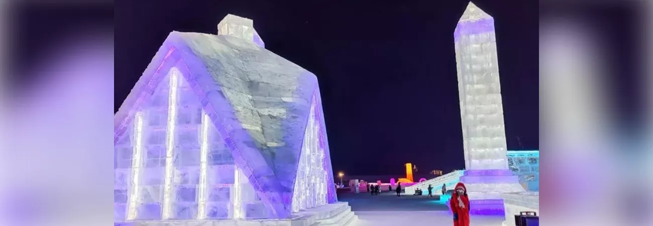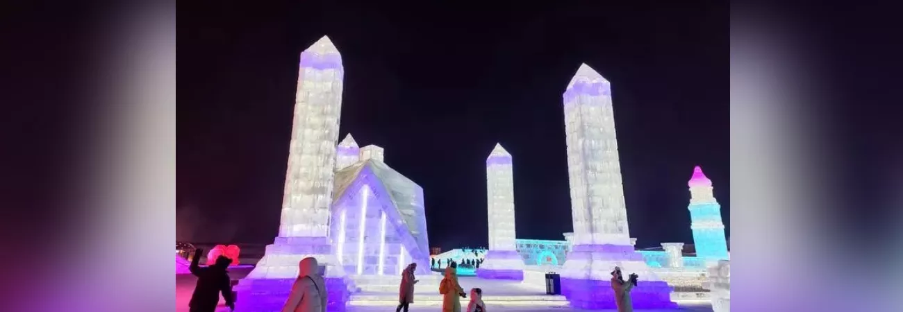 چین ، شمال مشرقی صوبہ حئی لونگ جیانگ کے دارالحکومت ہاربن میں چین کے سب سے بڑے آئس تھیم پارک میں برف سے بنے پاکستان کی فیصل مسجد کے نمونے کا رات کا منظر۔ (شِںہوا)