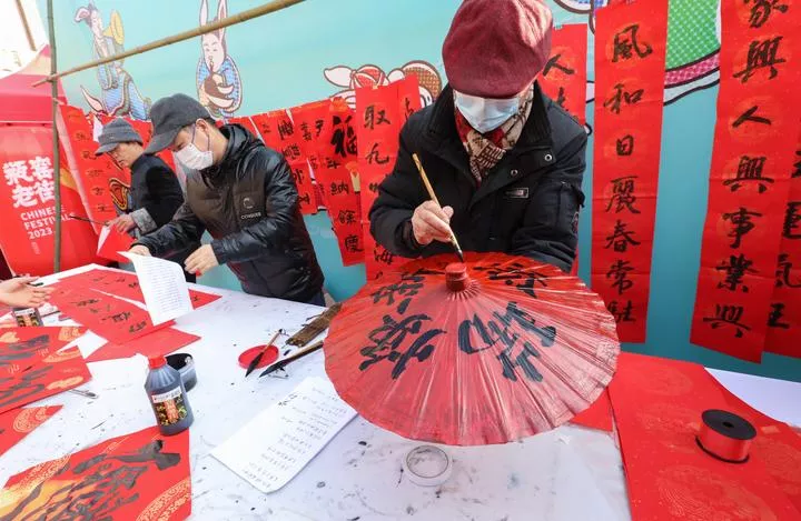 چین، مشرقی صوبہ ژے جیانگ کے شہر ہانگ ژو کے ضلع یوہانگ کے قصبے پھنگ یاؤ میں منعقدہ خریداری میلے کے دوران لوگ چینی خطاطی میں نئے سال کے خیرمقدمی الفاظ لکھ رہے ہیں۔ (شِنہوا)