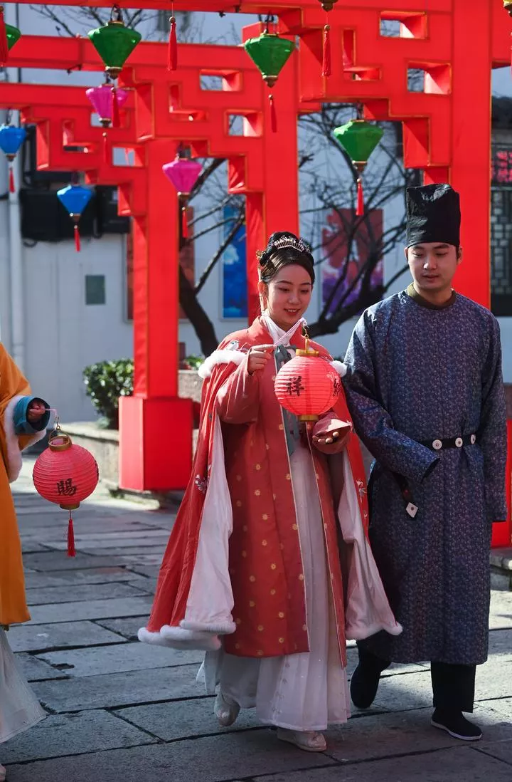 چین، مشرقی صوبہ ژے جیانگ کے شہر ہانگ ژو کے ضلع یوہانگ کے قصبے پھنگ یاؤ میں منعقدہ خریداری میلے میں لوگوں کو روایتی لباس میں دیکھا جاسکتا ہے۔ (شِنہوا)