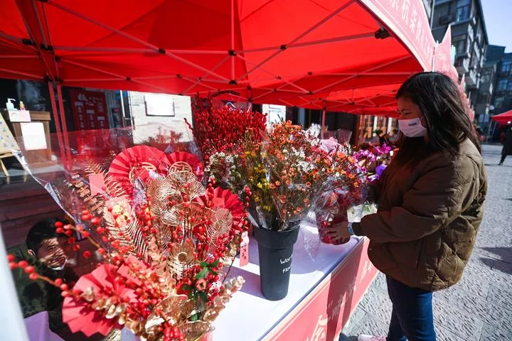 چین، مشرقی صوبہ ژے جیانگ کے شہر ہانگ ژو کے ضلع یوہانگ کے قصبے پھنگ یاؤ میں ایک خریداری میلے میں خاتون پھول خرید رہی ہے۔ (شِنہوا)