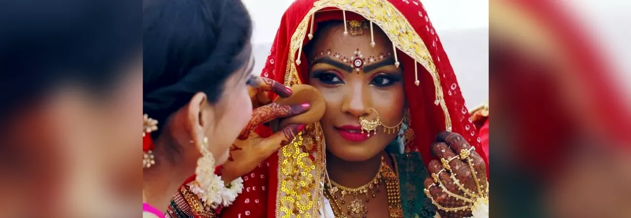 کراچی، شادی کی اجتماعی تقریب کے دوران ایک دلہن کا میک اپ درست کیا جارہا ہے۔ (شِنہوا)