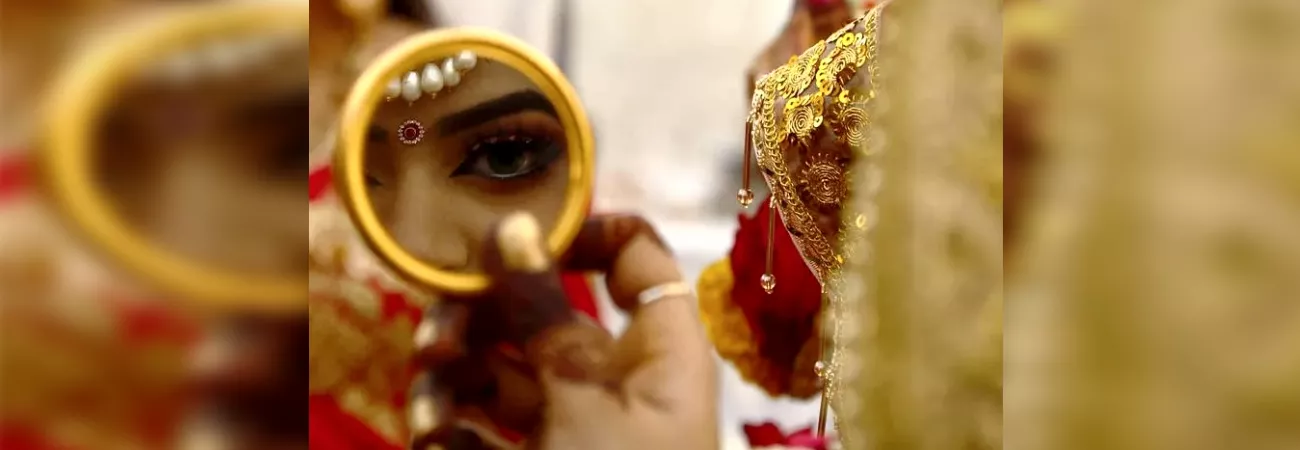 کراچی، شادی کی اجتماعی تقریب کے دوران ایک دلہن اپنا میک اپ دیکھ رہی ہے۔ (شِنہوا)