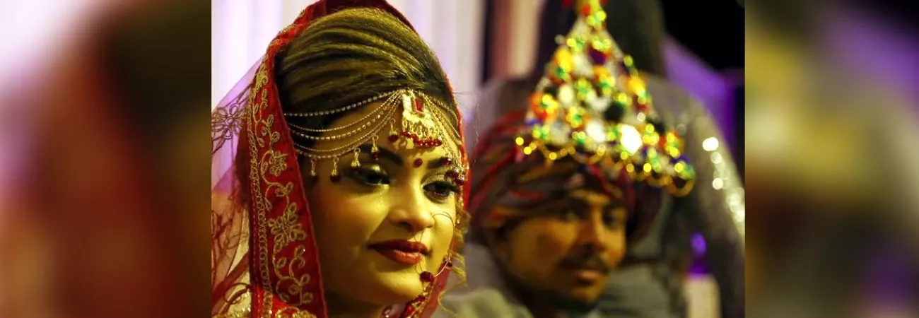 کراچی ، شادی کی اجتماعی تقریب کے دوران ایک دولہا اور دلہن کو دیکھا جاسکتا ہے۔ (شِنہوا)
