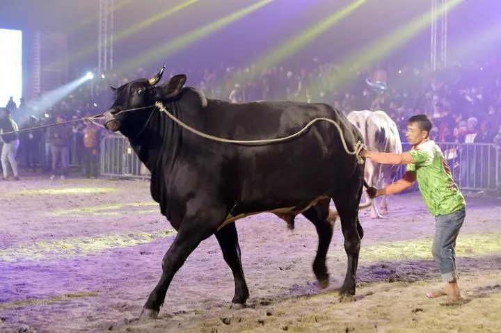 بنگلہ دیش، دارالحکومت ڈھاکہ میں ڈھاکہ مویشی نمائش 2023 میں ایک کسان اپنا بیل پیش کررہا ہے۔ (شِنہوا)