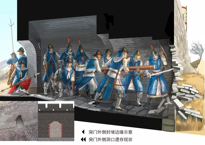 چین ،عظیم دیوار چین کے پو شیدہ دروازے کے اندرونی حصے میں سپاہیوں کو دروازے کو تو ڑتے ہو ئے اس خاکے میں دیکھا جاسکتا ہے۔ (شِنہوا)
